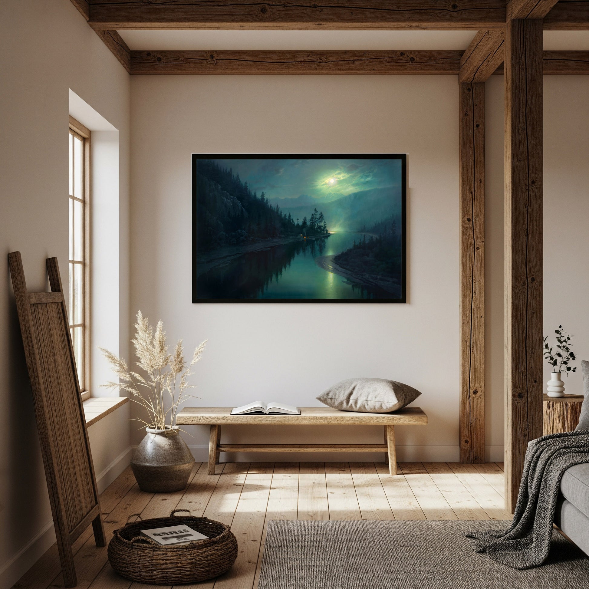 "Nocturne Prelude, Isaiah 12:2" captures the profound serenity of the wilderness at night, rendered in a masterfully moody oil palette of deep indigo and spectral emerald. The scene is a testament to quietude: a winding river reflects the intense, almost ethereal glow of a full moon breaking through a veiled sky, illuminating the mist rising off the distant river bend. Nestled along the bank, a hunter tending a campfire near his tent and canoe introduce a human element, a fleeting sense of presence that is nonetheless secured and at peace. This work is an artistic meditation on faith, drawing its spiritual strength from the verse "Behold, God is my salvation; I will trust, and not be afraid," suggesting that even in the vast, encompassing darkness, there exists a steadfast light and an unwavering sense of trust and refuge.
