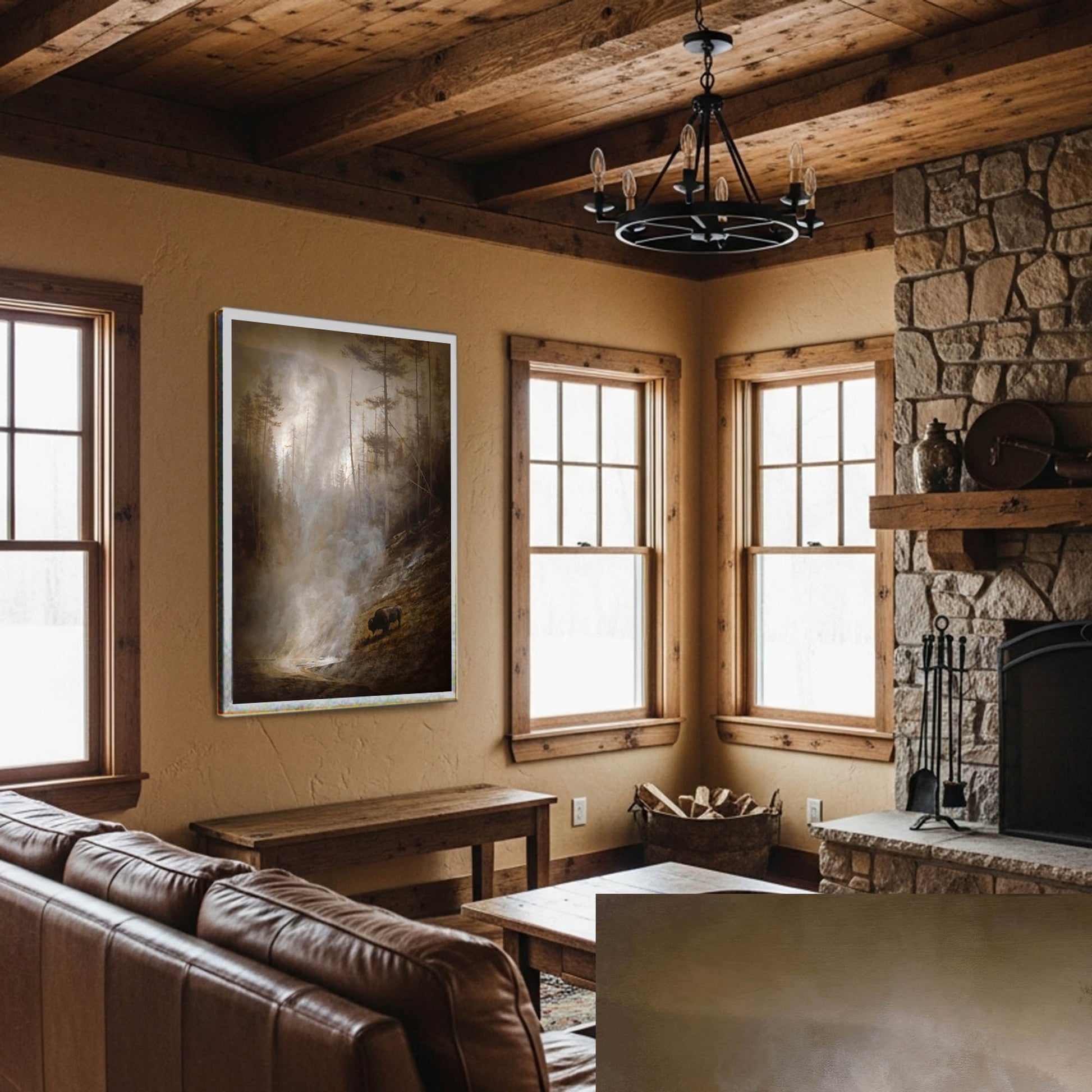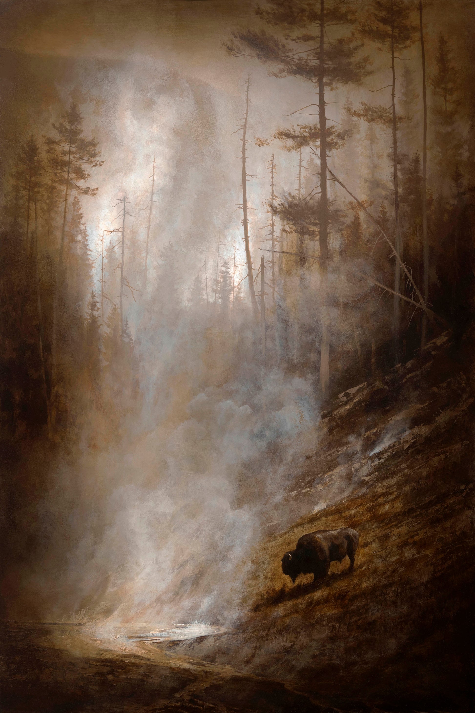 "Out of the Depths, Job 22:21," is an atmospheric meditation on trial and submission, where the towering forest dissolves into a luminous, sacred mist. From this blinding veil, a solitary bison—a primal symbol of resilience and the wild heart of creation—emerges along near a hot spring in Yellowstone Park, embodying the verse: “Be reconciled with Him, and be at peace; Thereby good will come to you.” The work captures the soul's journey through shadowed suffering and uncertainty, illustrating that moment of humble surrender where the overwhelming circumstances give way to a peace that is not the absence of trouble, but a profound reconciliation with a higher order, finding the way forward through the cleansing fog and toward the promise of light.